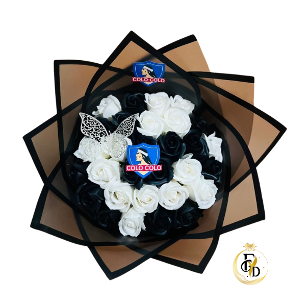 Exclusivo ramo de 30 rosas blancas y negras eternas de jabón con temática de el equipo de futbol Colo-Colo , con fina envoltura de papel coreano y tiernas mariposas para decoracion.