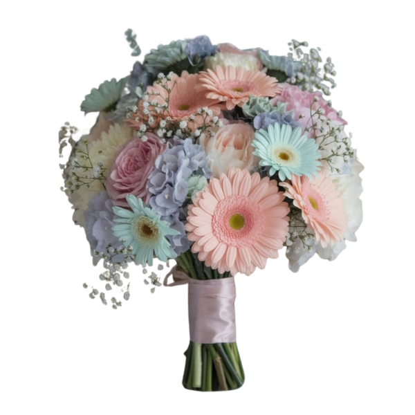 Lindo bouquet con gerberas, rosas , hortensia, entre otras flores con tallos envuelto en fina cinta satinada.