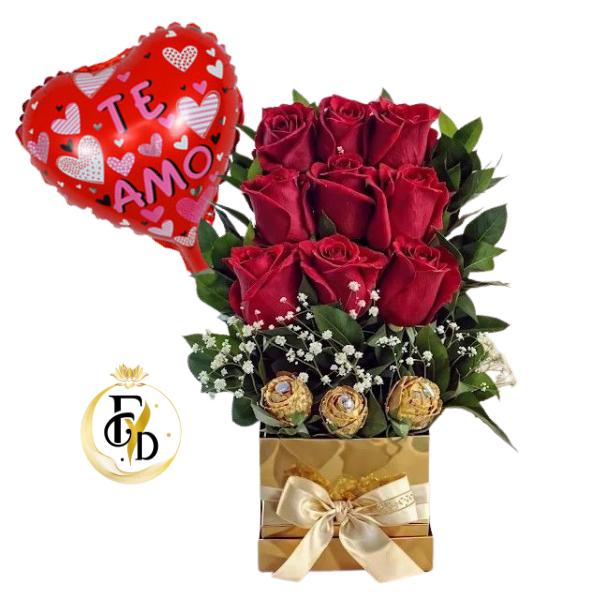 Lindo box con 9 rosas rojas que incluye verde y 3 deliciosos bombones, aparte incluye globito de te amo.