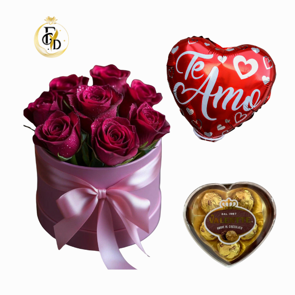 Pack que incluye box de 8 rosas fucsias, chocolates Valente de 5 unidades y globo (elegir temática del globo al momento de comprar)