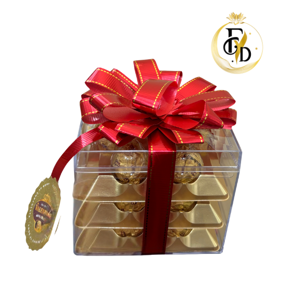 Linda caja acrilica con 18 bombones valentte de 18 unidades mas lindo roseton rojo.