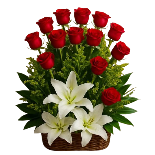 Linda canasta en 12 rosas rojas importadas mas verde de temporada y lirios blancos.