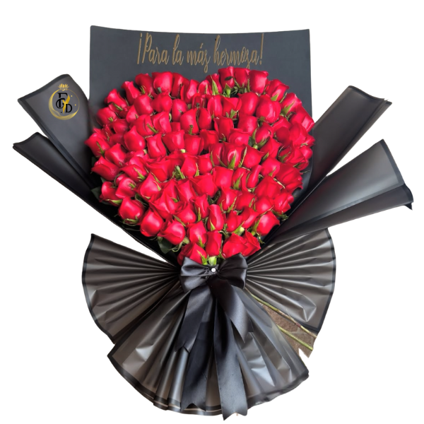Hermoso diseño de corazón en ramo de 50 rosas rojas importadas con fina envoltura de papel coreano y dedicatoria elegida por el remitente, todo con lindo lazo de cinta satinada
