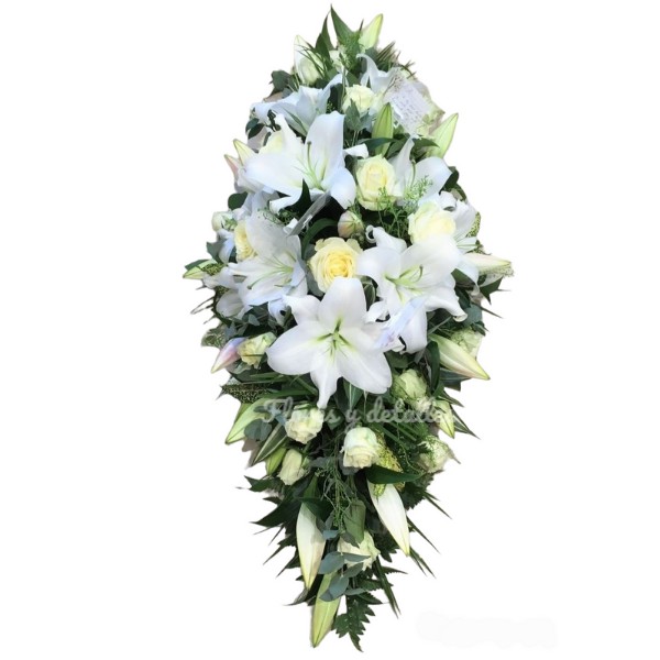 Elegante cubre urna en lilium blanco y rosas blancas importadas mas fino follaje. MEDIDAS 90CM