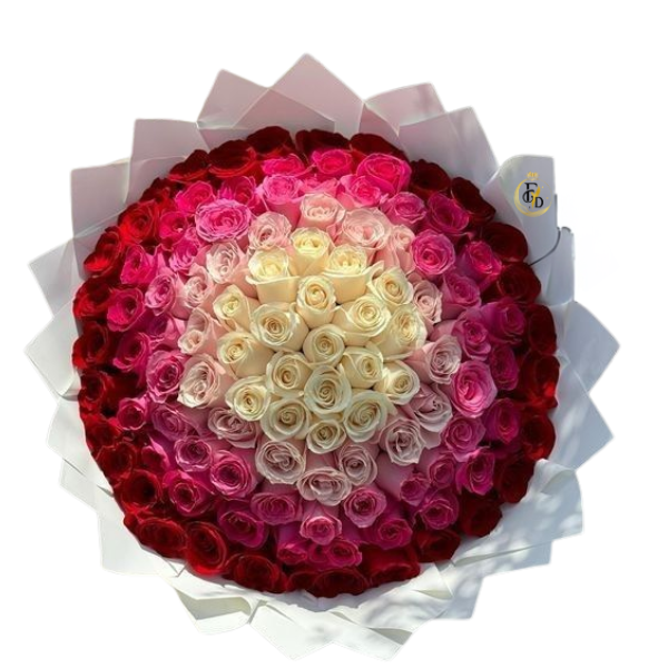 Hermoso ramo de 100 rosas importadas en tonos rosados con elegante envoltura de papel coreano y rosetón con cinta de tela.