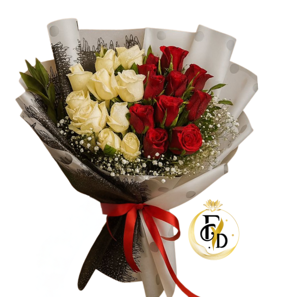 Hermoso diseño en ramo con 20 rosas , mitad 10 rojas y mitad 10 blancas con fina envoltura en papel coreano y lazo con cinta satinada.