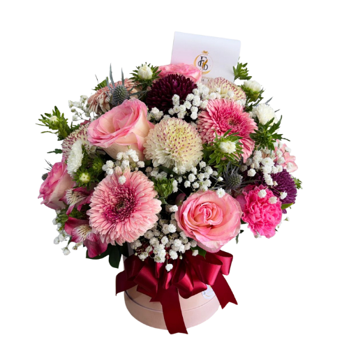 Hermoso mix de flores en box cilindro, incluye mini rosas, gerbera, Maule margarita, ilusión y eucalipto mas follaje de temporada, todo con lindo lazo de cinta de tela.