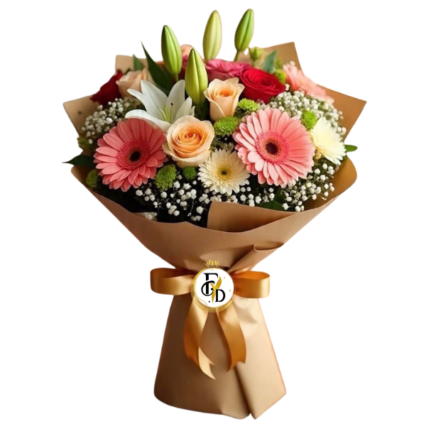 Ramo con flores mixtas primaverales, todo envuelto en fino papel kraft y lazo con cinta satinada.