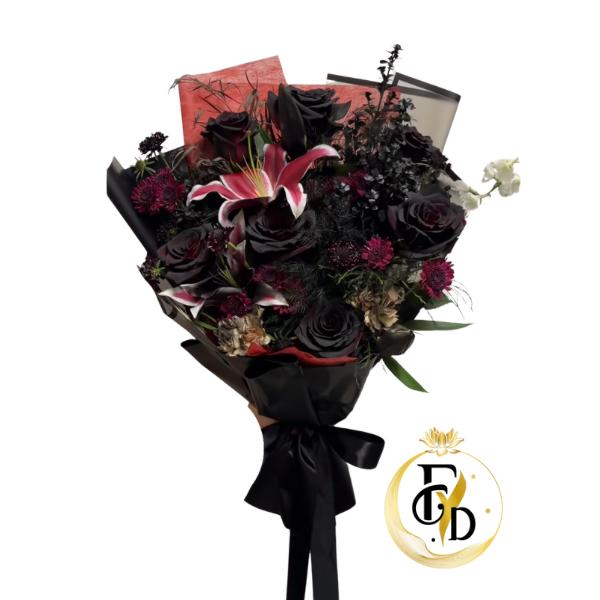 Lindo ramo de 20 rosas importadas teñidas de negro más follaje de temporada en tonos oscuros y liliums todo en fina envoltura de papel coreano color sobrio y lazo con cinta de tela.