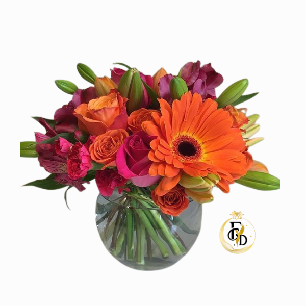 Fina pecera primaveral que incluye gerbera, 10 rosas naranjas y fucsias, lirios y claveles.