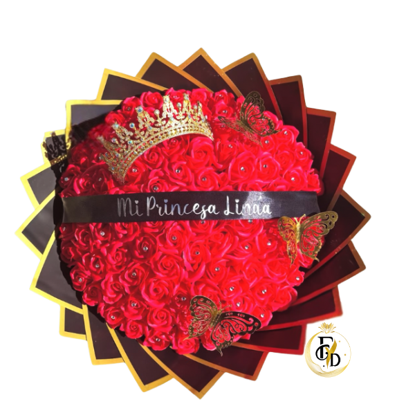 Hermoso ramo de 100 rosas eternas de jabón rojas mas lindaa cinta personalizada , linda diadema y mariposas para decoracion, todo envuelto en fino papel coreano y lazo con cinta de tela