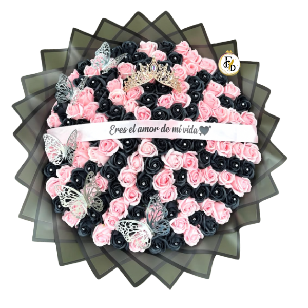 Espectacular ramo de 150 rosas eternas de jabón bicolor mas linda cinta personalizada (Frase elegida por remitente) mas hermosa diadema y mariposas para decoracion con fina envoltura de papel coreano y rosetón con cinta de tela.