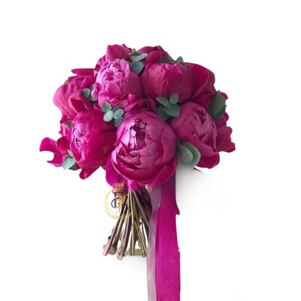 Lindo bouquet de novia con 10 peonias importadas y toques de eucalipto mas tallos envueltos con fina cinta de tela. ( Preguntar disponibilidad de Color)