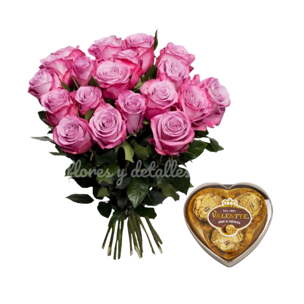 Lindo ramo en 24 rosas lila envuelta en papel coreano y lazo en cinta de raso mas bombones valentte 35,7 gms. (PROMOCION HASTA AGOTAR STOCK)