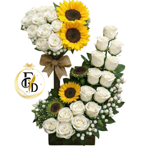 Exclusivo diseño con 15 rosas blancas en escalas con follaje y 3 girasoles más un diseño de corazón con 10 rosas blancas importadas y dos girasoles, todo en fina base de madera y lazo con rafia.