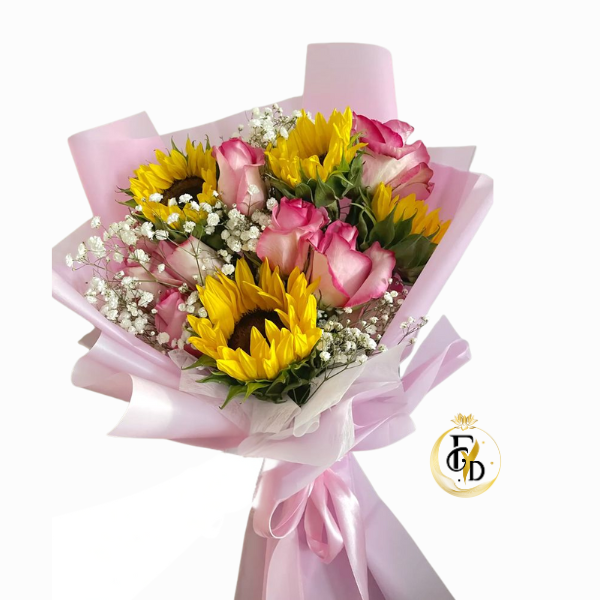 Fino ramo con 10 rosas rosadas importadas, 5 girasoles y ilusión con extendida envoltura de papel coreano y lazo con cinta satinada.