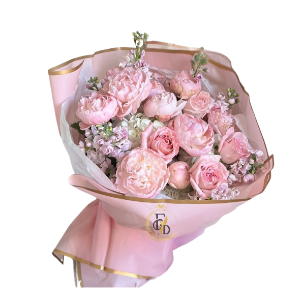 Elegante ramo de 10 lindas peonias importadas mas 5 rosas importadas , ilusión y follaje de temporada, todo en fina envoltura de papel coreano y lazo con cinta de tela.