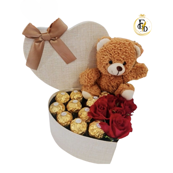 Lindo box de corazon con 6 rosas importadas , 10 bombones valentte y tierno peluche de oso (medidas 20cm) y lindo lazo con cinta de tela.