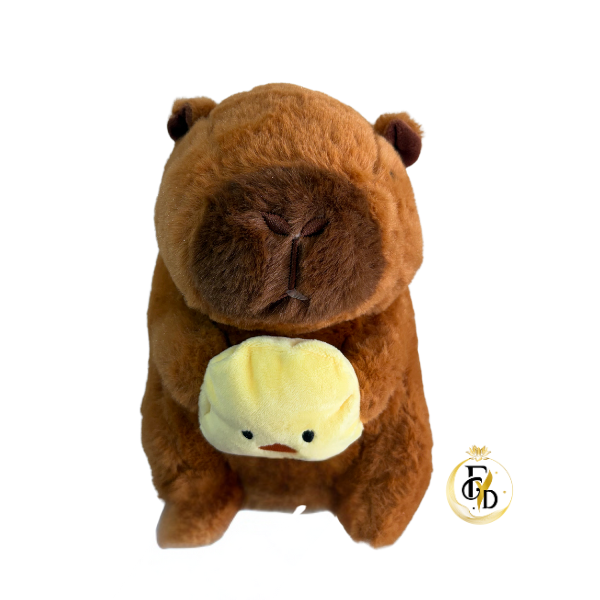Lindo peluche importado de Capibara abrazando a pollito , medidas 25/30 cm